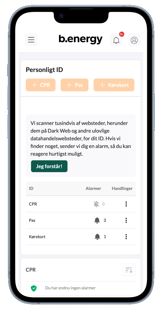 b.safe+ er vores premium version, der giver udvidet overvågning, personlig assistance og økonomisk dækning.